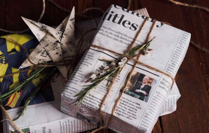 Lehet egy régi lapszám, amelynek jelentése van, de lehet valamelyik napilap is, amelyet jónak találsz... Feldobhatod madzaggal, spárgával, vagy színes szalagokkal, masnikkal, amelyeket aztán az ajándékozott el tehet későbbi csomagolásokhoz. A csomagot díszítheted természetes anyagokkal, mint pl.: borostyán, fagyöngy, fenyőág, fenyőtoboz, magyal, szárított narancskarika, száraz virágok vagy kézzel készített díszekkel, legyen szó kártyáról vagy süteményről. Egy jó tanács: a fekete-fehér újságok jobban mutatnak, a színes társaiknál.