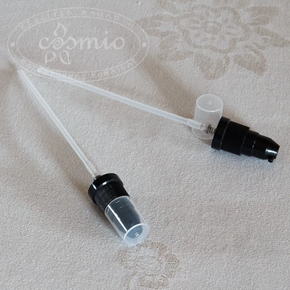 Fekete, pumpás adagolófej a barna és a kék folyadéküvegekhez (18 mm-es üvegnyakra), 13 cm hosszú szárral, így minden méretű üveghez méretre szabható. Alkalmas folyósabb állagú krémek és olajok pontos és higiénikus adagolására.